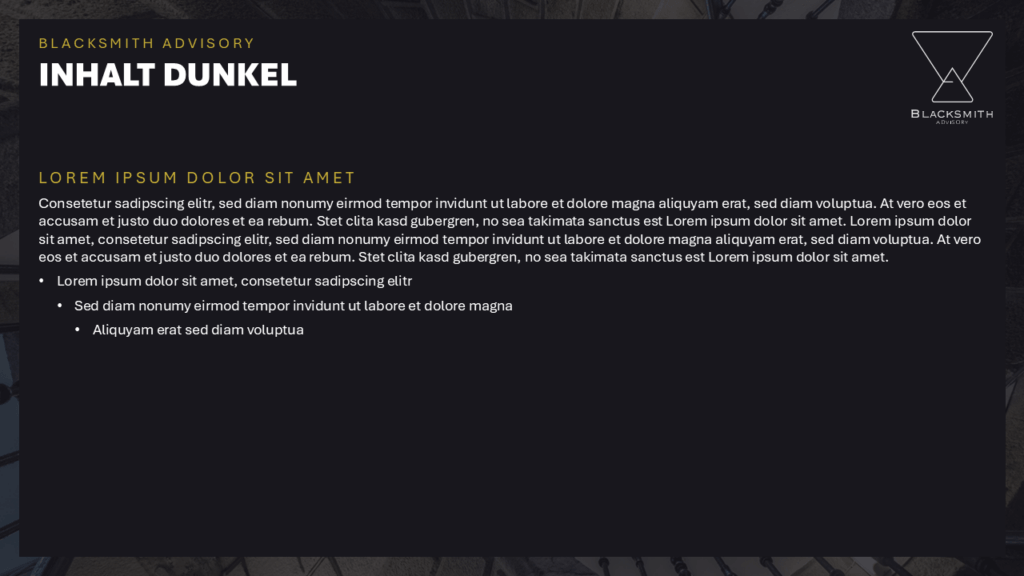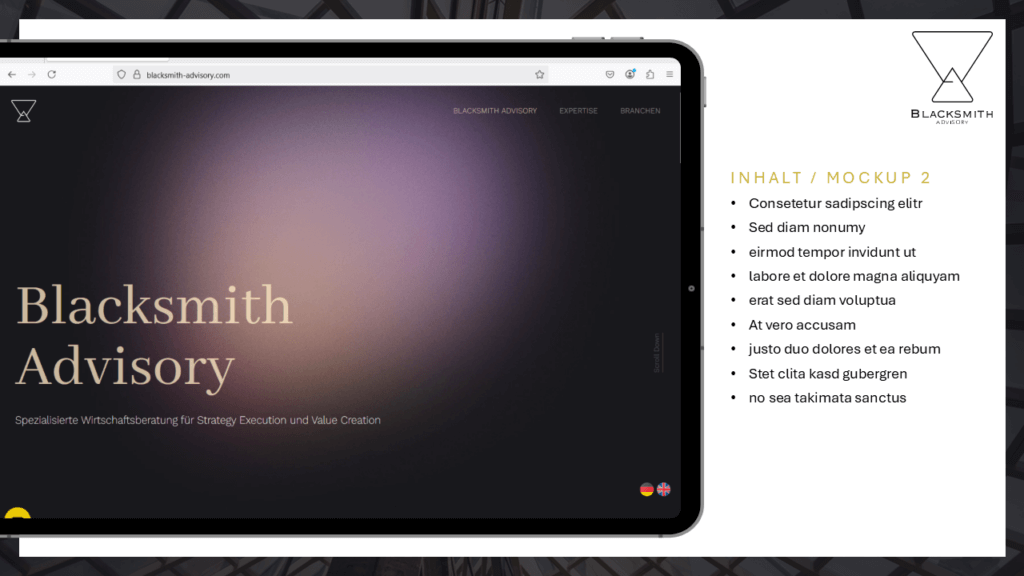 Gestaltung eines neuen Präsentationslayouts im 16:9-Format mit Fokus auf visuelle Qualität. Das Design orientiert sich am neuen Corporate Design und überträgt die visuelle Sprache der Website in ein klares, professionelles Folienset.