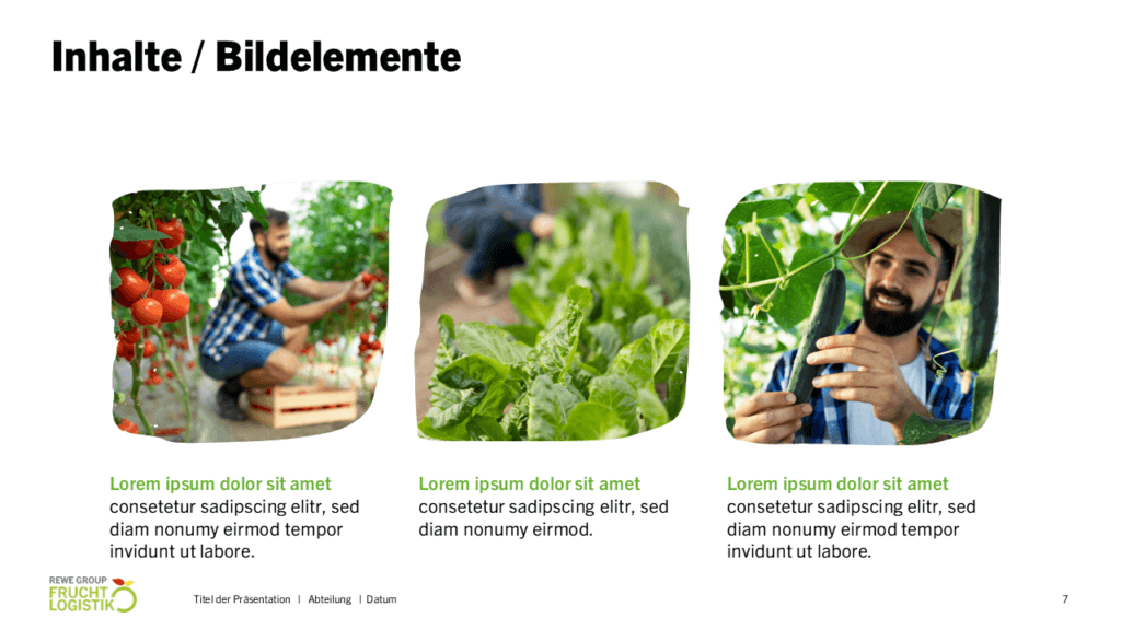 Das können Folien-Layouts sein, die inhaltlich immer wieder in Präsentationen auftauchen, oder Layout-Vorschläge für die Visualisierung von neuen Inhalten bieten.