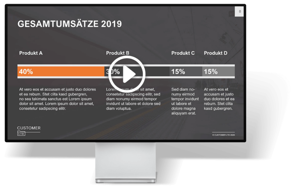 Sie stellen uns nach Abschluss der Datenerhebung einen Tabellenband mit den Studiendaten (Excel) sowie einen konkreten Auswertungswunsch, welche Sachverhalte / Ergebnisse Sie dargestellt haben möchten, zur Verfügung. In einem anschließenden Briefinggespräch finden wir gemeinsam heraus, welche Daten, Ergebnisse und Aussagen aus dem Pool der erhobenen Daten, in den Fokus der Präsentation gerückt werden sollen. Wir übernehmen die professionelle Umsetzung in PowerPoint. Wir können Ihr bestehendes Folienlayout und Corporate Design übernehmen oder helfen Ihnen gerne bei der Erstellung eines neuen Präsentationslayouts.